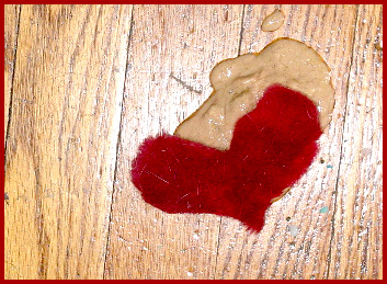 Then this morning, on my way out the door, just minutes after feeding my cats, and running very late for an appointment, I found this. THIS. The heart was exactly where I'd found it last night - same latitude and longitude, but at a slightly different altitude. Something had slipped beneath it, mysteriously. How did it get under there, without disturbing the heart? What kind of sign is this? Why were my cats chosen as the messengers? And, really, what kind of oblivious jackass am I that I require an omen of this magnitude and base simplicity? I'm sure I'm supposed to do something now, something monastic, probably, but in the meantime I've decided to simply make a record, clean up the mess and throw my small, vomit-soaked heart in the trash where it belongs.